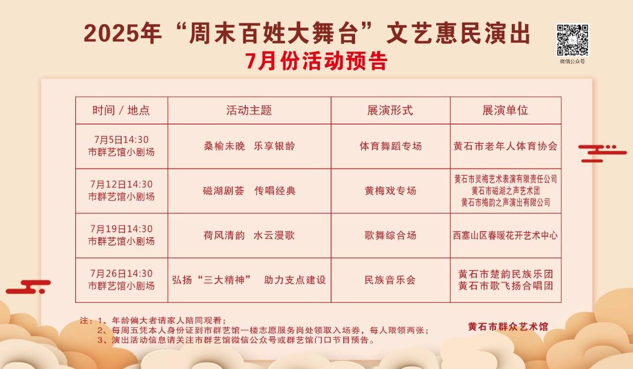 黄石市群众艺术馆以“周末百姓大舞台”文艺惠民演出来给市民送清凉。体育舞蹈动感活力,带来力与美的交响;黄梅戏婉转唱腔,感受韵律悠扬满城芳;歌舞优美轻扬,共度夏日清凉歌舞盛宴;民族音乐会悠扬韵律,让丝竹管弦沁人心。这个暑期的周末,快来黄石群众艺术馆,一起遨游在艺术的海洋。