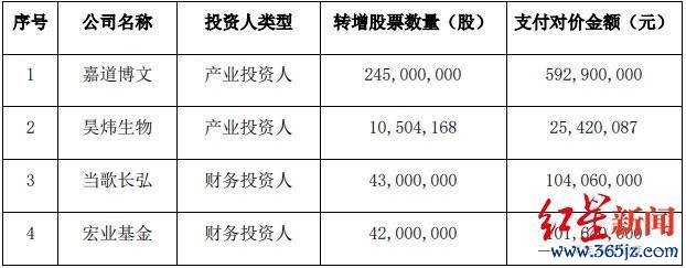 各方投资人拟以*ST长药现有总股本3.5亿股为基数,按每10股转增15股的比例进行资本公积金转增股本,共计可转增5.26亿股,转增价格为2.42元/股(公司股价约5元/股)。转增完成后,上市公司的总股本增至8.76亿股。