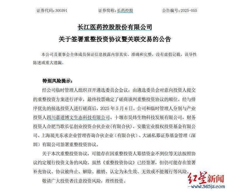 5月8日,*ST长药发布公告称,公司和临时管理人分别与产业投资人四川嘉道博文生态科技有限公司(简称“嘉道博文”)等六家机构签署重整投资协议。根据协议,投资人将通过“现金注资+资源导入”方式协助公司清偿债务、恢复持续经营能力。